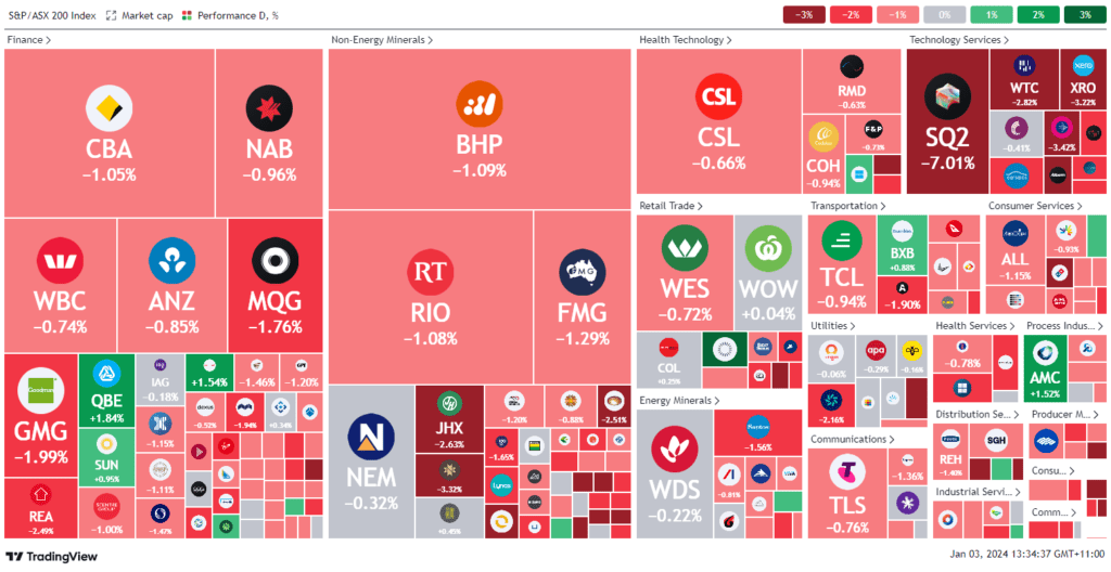 ASX declines in second trading day of 2024. Shares experienced a 1% decline, primarily led by the technology sector, reflecting the downturn on Wall Street amid concerns that central banks may delay interest rate cuts. The S&P/ASX 200 index retreated 1.1%, reaching 7546.5 points, while the All Ords also registered a 1.1% drop. Despite Tuesday’s close near the August 2021 peak, ten of the index’s eleven sectors saw declines, with real estate and mining exerting downward pressure. Consumer staples was the sole advancing category. Block faced significant losses, plummeting 6.7% due to its involvement in a Nasdaq sell-off. Commodity stocks, encompassing gold, iron ore, lithium, and oil, were notably impacted. Fortescue Metal shares fell 1.6%, responding to a recent iron ore supply disruption. BHP Group, Rio Tinto, Santos, and Whitehaven Coal recorded declines despite elevated iron ore prices. The Australian dollar remained stable at US67.64¢, following a 0.8% dip on Tuesday linked to heightened US dollar strength amid revised expectations for Fed rate cuts in 2024.