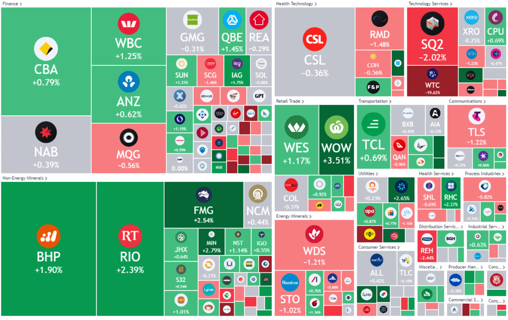The ASX experienced its most significant daily increase since July 27, rising 0.7%, even with a downturn in the tech sector. Woolworths stood out with a 4.2% jump following its 4.6% annual profit growth to $1.62 billion. Domino’s Pizza surged by 9.5% after announcing job cuts, though it reported a 74% drop in net profit and reduced its dividend. Tech stocks suffered, dropping nearly 6%, with WiseTech’s 20% decline being a significant contributor after its earnings missed projections.