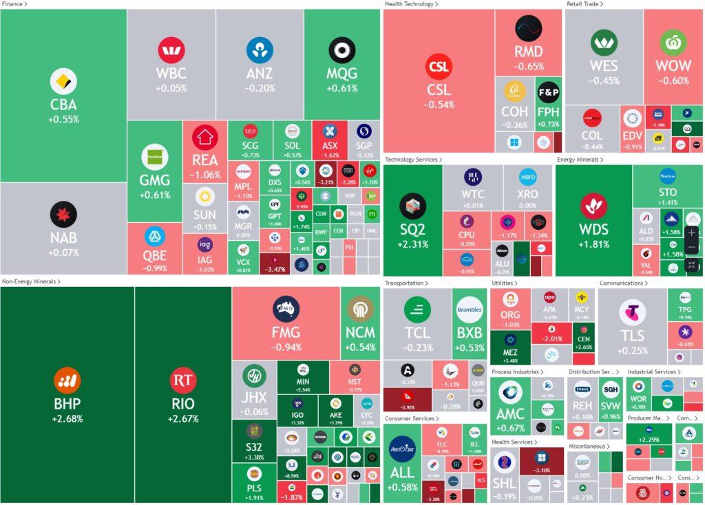 Materials and energy stocks held up the index today as gains in BHP the biggest stock on the ASX 200, said a Brazilian court had approved its plans to reorganize its Samarco joint venture, as part of the repercussions of a 2015 dam collapse that killed 19 people and was Brazil’s worst ever environmental disaster.