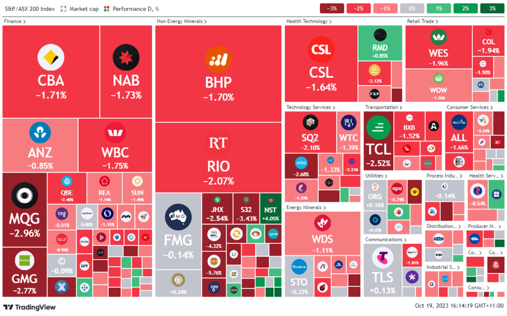 The ASX faced a significant downturn, dropping over 100 points, influenced by escalating Middle East tensions and unexpected domestic unemployment figures. The S&P/ASX 200 plummeted by 1.5%, with all sectors, notably materials, financials, and tech, experiencing losses. Major banks such as Commonwealth Bank, ANZ, National Australia Bank, and Westpac saw declines exceeding 1%. Despite a fall in the jobless rate to 3.6% in September, concerns linger due to a withdrawal of around 13,000 people from the labour force, rather than increased employment. Global market sentiments were also affected by geopolitical uncertainties, with the Dow Jones, S&P, and Nasdaq all experiencing losses. Specific stocks like Qantas and Telix Pharmaceuticals faced notable declines, while Weebit Nano saw a surge due to a new commercial agreement. The market’s direction seems to be influenced by a combination of international geopolitical events and domestic economic indicators, awaiting crucial CPI figures amidst global uncertainties.