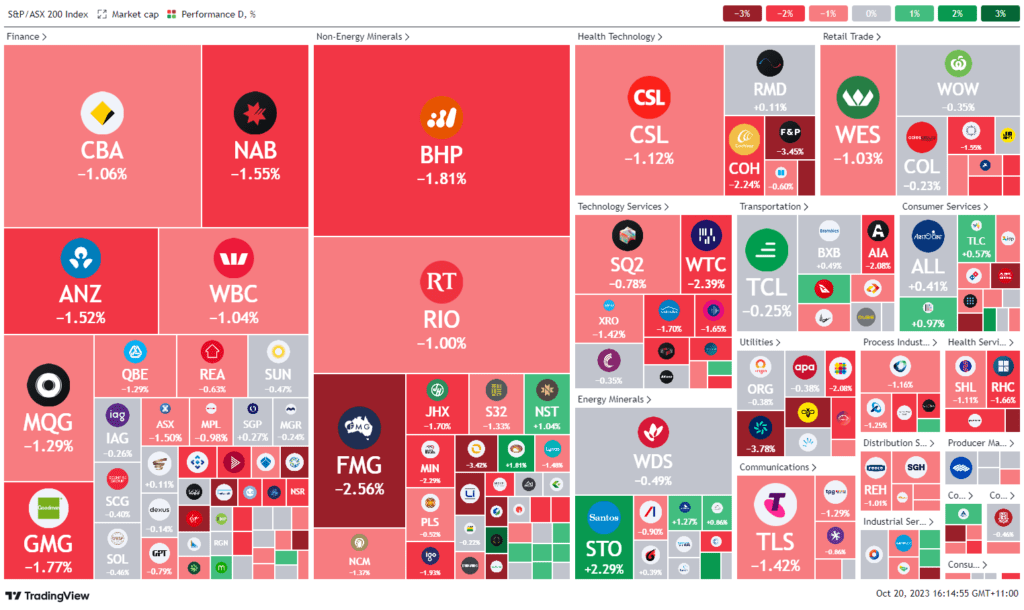 The ASX faced a 1.1% decline, influenced by rising global tensions and uncertainties. Investors, wary of the escalating conflicts in the Middle East and Ukraine, and the surging US 10-year government bond yields, exhibited a cautious approach, leading to a broad market pullback. The energy sector saw modest gains due to a rise in Brent crude futures, amidst fears of a prolonged Israeli-Hamas conflict potentially drawing in Iran, escalating geopolitical risks. Gold miners flourished as gold prices soared, setting a record in AUD terms. Conversely, the materials sector suffered, influenced by significant capital raises and strategic moves within the industry, reflecting the market’s reactive nature to internal and geopolitical factors. The market also responded to executive movements within companies and anticipates key economic indicators and fiscal strategies from the US and Australia in the coming days.