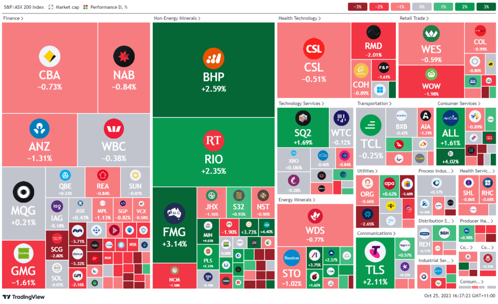 The ASX experienced a tumultuous trading day, influenced by a higher-than-expected September quarter CPI report, eventually regaining stability to trade flat. The S&P/ASX 200 slightly rose, despite initial dips influenced by unexpected inflation figures. Materials stocks, particularly iron ore miners like BHP, Fortescue Metals Group, and Rio Tinto, witnessed significant gains, contrasting the losses in the real estate and consumer sectors. The CPI rose by 1.2% in the September quarter, surpassing the anticipated 1.1%, reflecting an annualized increase of 5.4%. This unexpected inflation trajectory has left the Reserve Bank of Australia (RBA) in a precarious position regarding interest rate adjustments in their upcoming November 7 meeting. Following the CPI report, the Australian dollar and government bond yields experienced a slight increase. In corporate highlights, companies like Kogan and Corporate Travel Management saw stock rises due to positive quarterly reports, while others like Magellan and Dexus faced declines due to executive reshuffles and other internal adjustments.