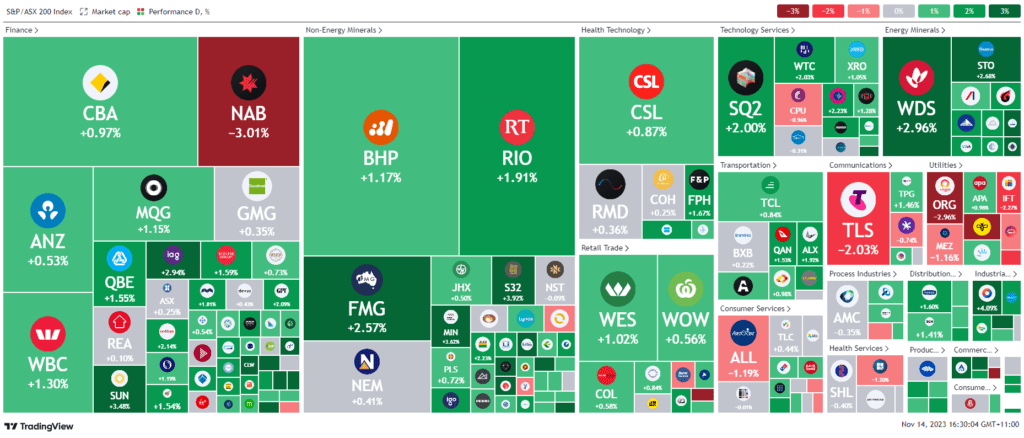 The market largely overlooked the negative sentiment from the Westpac-Melbourne Institute consumer survey, which indicated a sharp drop in mood following recent interest rate increases. Mining giants like BHP Group, Rio Tinto, and Fortescue saw their shares rise by over 1% each, fueled by consecutive gains in iron ore futures and optimism about China’s property sector. Gold and lithium producers also saw an uptick.