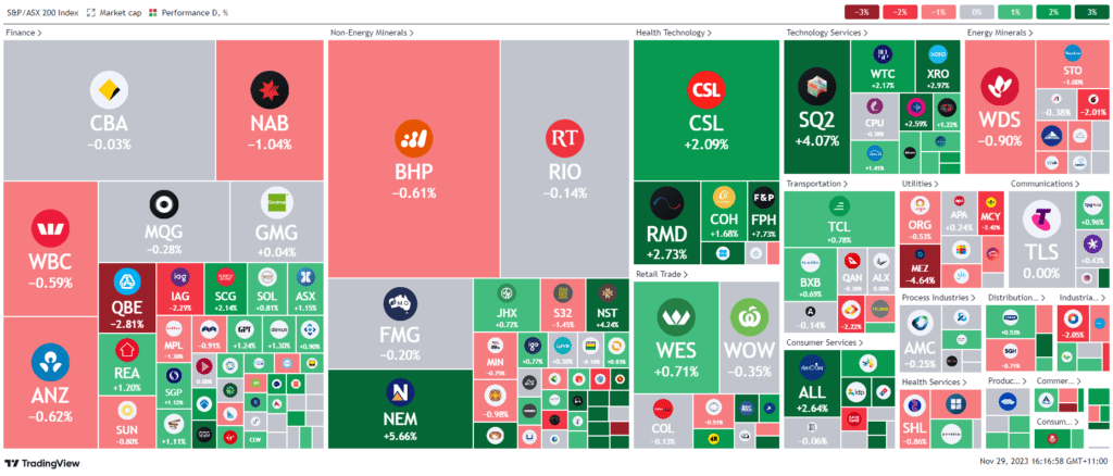 Key stock movements included Healius, up by 8.8%, Fisher & Paykel Healthcare rising 7.5%, and EML Payments dropping 30.6% amid profit and revenue expectations adjustments. Codan slightly declined by 0.4% after its acquisition of Wave Central, while Harvey Norman rose 3.1% despite reporting declining sales.