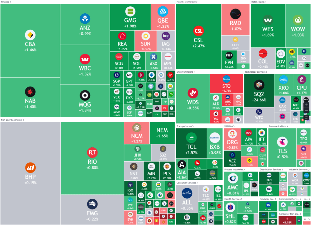 The AU market moved higher, tracking strong gains on Wall Street, as hopes the Federal Reserve may finally be done with raising interest rates gathered momentum.