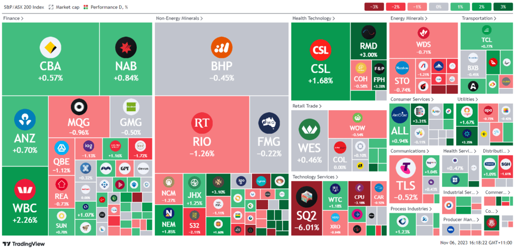 Westpac’s shares climbed 3.4% after a profit surge and buyback announcement. Goodman Group’s shares dipped despite a positive earnings forecast. Weebit Nano initially jumped on its first revenue report but then fell back. Block Inc dropped after a recent surge, while Whispir skyrocketed 60% due to a takeover bid. Talga Group shares fell after announcing a share offer to fund its anode project, and IRESS surged 7.5% following an upgrade by JPMorgan.