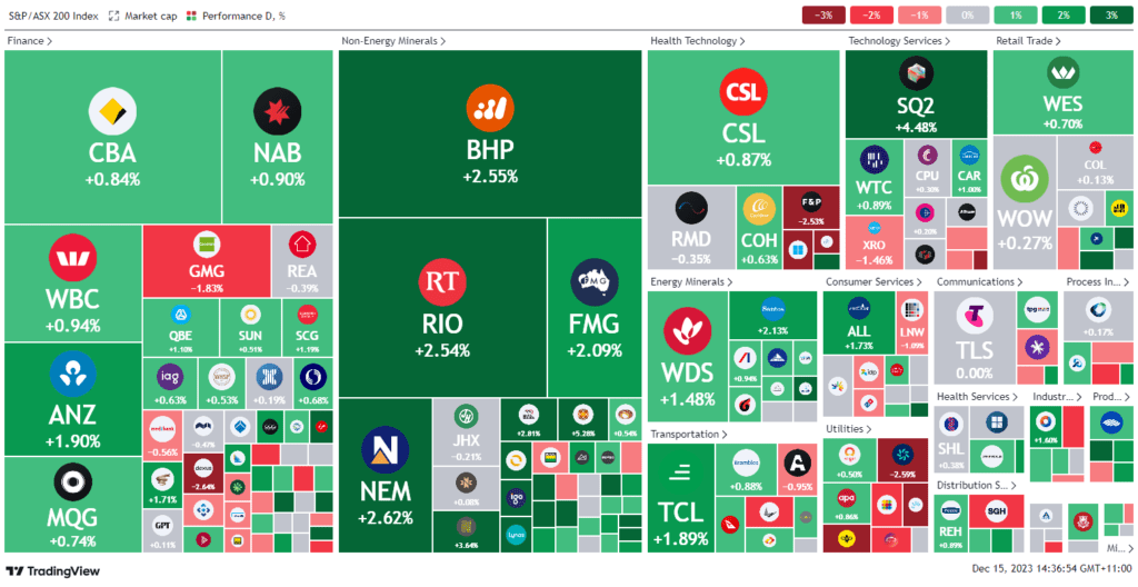 The S&P/ASX 200 surged 64 points, or 0.9%, reaching 7442, propelled by a rally in metal and energy prices. The weakening US dollar elevated copper, gold, oil, iron ore, and natural gas prices. The materials sector witnessed a 2.1% boost, with Fortescue Metals achieving a record high of $28.15. Both Rio Tinto and BHP experienced gains, and gold miners benefited as gold reached $2052 per ounce.
