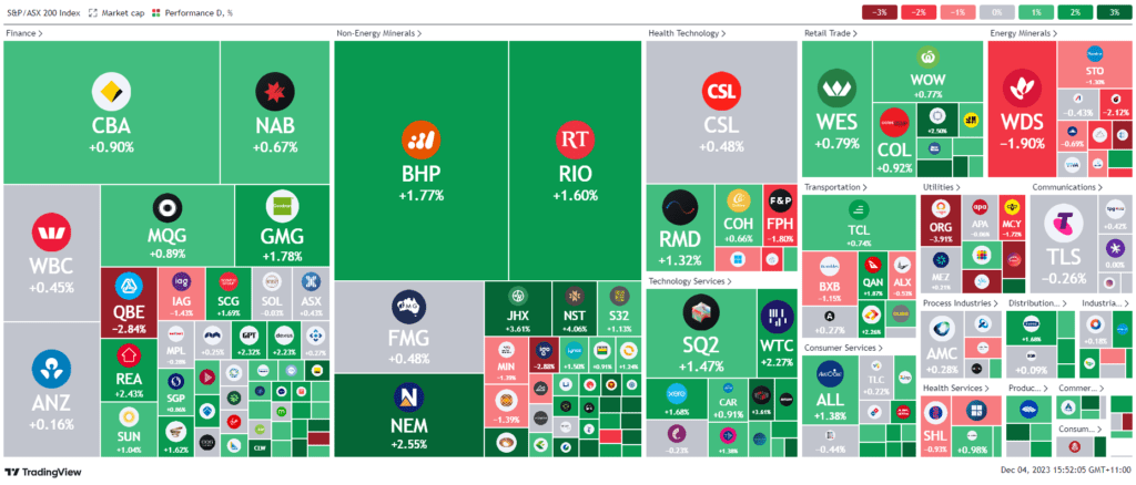 Key sectors contributing to this rise included miners, real estate, and technology stocks sensitive to interest rates. The materials sector, in particular, saw a 1.3% jump, with major companies like BHP and Rio Tinto gaining 1.5% each. Gold prices also soared, initially surpassing their August 2020 peak before reducing gains, positively impacting gold miners like Northern Star Resources and Newmont.