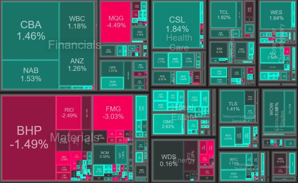 Technology stocks were among the best performers, up 2.7 per cent. WiseTech shares jumped 2 per cent, Xero added 2.8 per cent, Nextdc rose 3.2 per cent and Technology One climbed 2.4 per cent. Software company Megaport surged 10.5 per cent after it reached the top end of its earnings guidance. The real estate sector rallied 2.9 per cent and was led by gains in Goodman Group, advancing 2.8 per cent. Westfield parent Scentre rose 2.9 per cent and Mirvac jumped 3.3 per cent. Investment bank Macquarie tumbled 4.4 per cent following reports that its profit took a hit. Iron ore giant Fortescue Metals lost 1.3 per cent even as it beat analysts’ expectations and delivered at the top end of its target for the year to June 30.