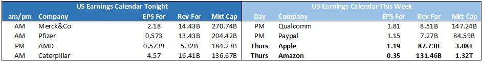 - Earnings – Drug giants Pfizer and Merck, Caterpillar and AMD deliver earnings tonight