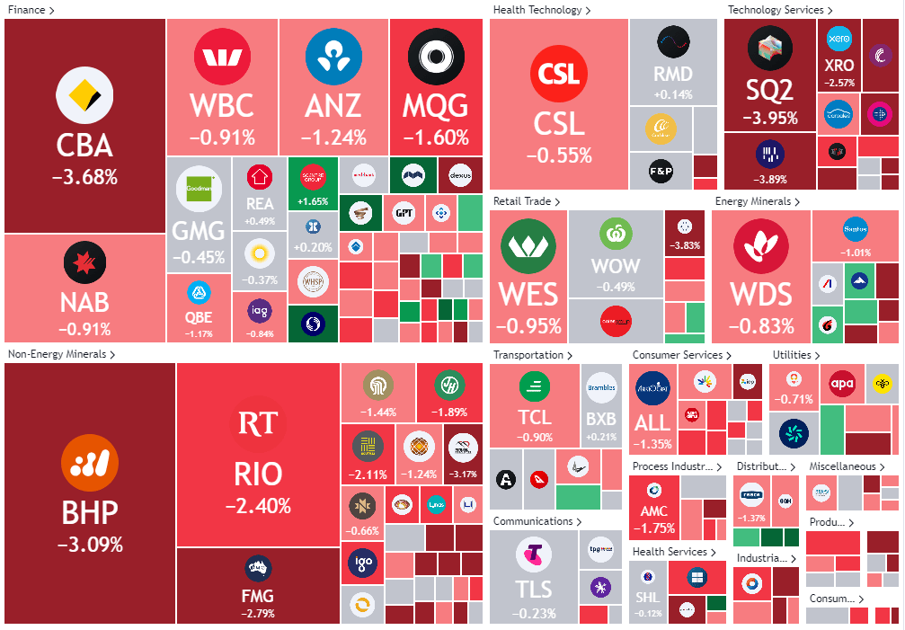 - Commonwealth Bank (CBA: ASX) – One of Australia’s largest banks, CBA saw its shares drop by 3.59%. The bank began trading ex-dividend today, which often leads to a temporary decrease in share price.