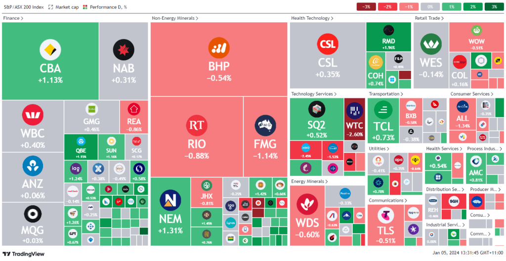 Australian shares are holding steady near midday, supported by gains in banks and insurers, with anticipation surrounding a crucial US labor force report later tonight. The S&P/ASX 200 is marginally up by 0.1% at 7502 points, while the All Ordinaries remains flat. Despite this, the benchmark is poised to conclude its first week of 2024 with a 1% decline, marking its weakest initial week performance since 2021. Financial stocks lead the positive momentum, rising by 0.5%, propelled by a 1.1% surge in Commonwealth Bank shares. As oil and iron ore prices dip, gold prices rise.