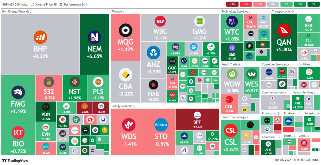 In the week’s opening session, the Australian stock market saw gains, driven by a significant uplift in technology shares, which helped counteract declines from energy companies Woodside and Santos. The S&P/ASX 200 index rose by 0.1% to 7,784.5 points, mirroring a positive shift in the All Ordinaries index. The upward momentum follows a robust jobs report from the U.S., where 303,000 jobs were added in March, exceeding expectations and nudging the unemployment rate down to 3.8%. Consequently, U.S. markets experienced gains across major indices. However, energy stocks on the ASX underperformed, dropping by 0.8% amid cooling oil prices. Noteworthy movements include Life360’s 17% surge after reporting a record number of active users, while Elders plunged 24% due to trading challenges. Additionally, Qantas announced a $448 million share buyback and enhancements to its loyalty program, with shares up 3.4%. Other notable mentions include Qoria’s rejection of a takeover bid, Ansell’s acquisition halt, and significant drops for Beach Energy and APM Human Services due to operational and financial setbacks.