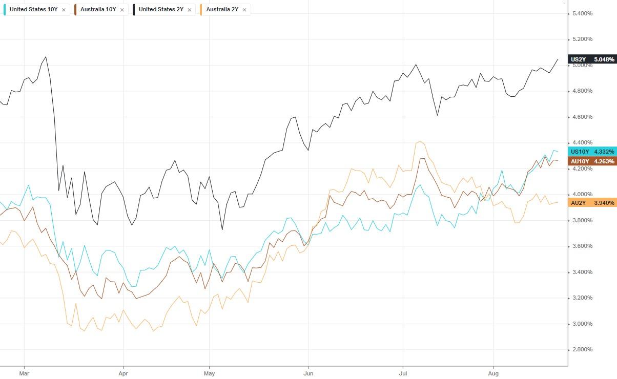 Tech stocks slipped as Treasury yields remain elevated, with the US2Y treasury yield, which is more sensitive to Fed rate hikes, topping 5% to hit its highest level since early July. The move lower in tech comes just a day ahead of Nvidia’s quarterly results that many see as a barometer of AI demand and another catalyst for tech should the chipmaker impress. The guidance from Nvidia might be that they can’t produce chips enough fast enough and that may be a concern at this eye watering level