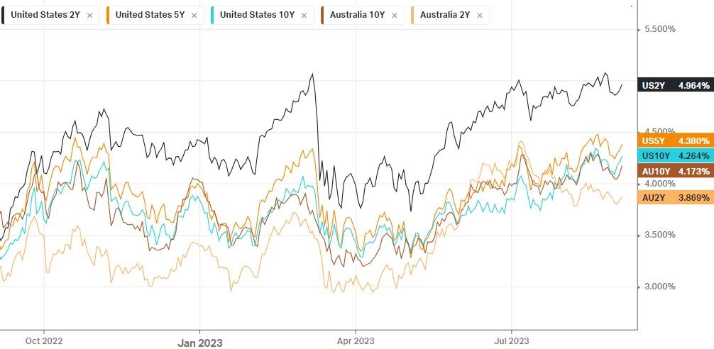 The ASX is in for another heavy day despite rising Iron ore prices and the RBA pause yesterday. Investors are beginning to realise whilst the softening economic numbers are positive in terms of a peak in rates, they are just that, weakening economic numbers, as the second steepest hiking cycle in history starts to bare teeth on the economy. China’s string of soft numbers was also extended yesterday with services PMI lower than expected, however the likely bond payment from Country Garden allayed fears of a default from one of the worlds largest property developers.