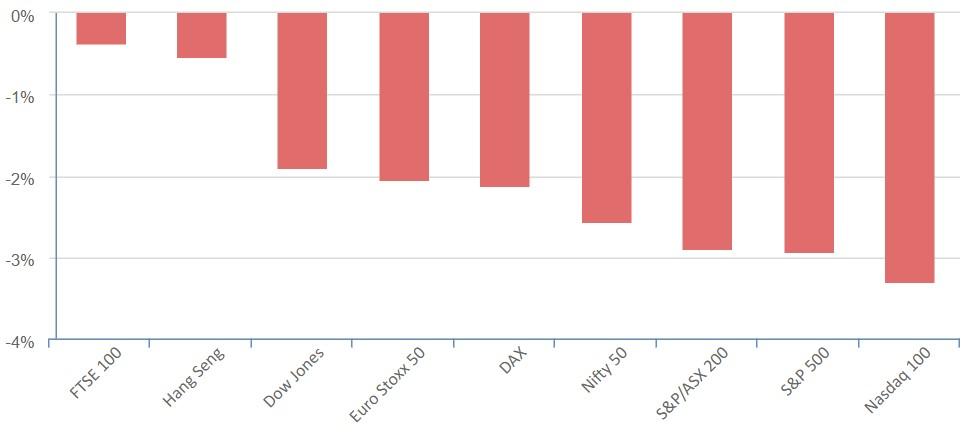 All three major U.S. stock indexes oscillated for much of the session but ended red. All three posted weekly losses, with the S&P 500 and the Nasdaq registering their largest Friday-to-Friday percentage drops since March.