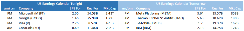 Alphabet climbed despite fresh regulatory concerns after the Japanese Federal Trade Commission launched an investigation for alleged antitrust violations concerning whether the company shared ad-revenue with android phone makers in return for pre-installing Google’s apps including its search engine rather than rival apps. Meta, IBM, Amazon and Intel report results on Wednesday and Thursday, respectively.