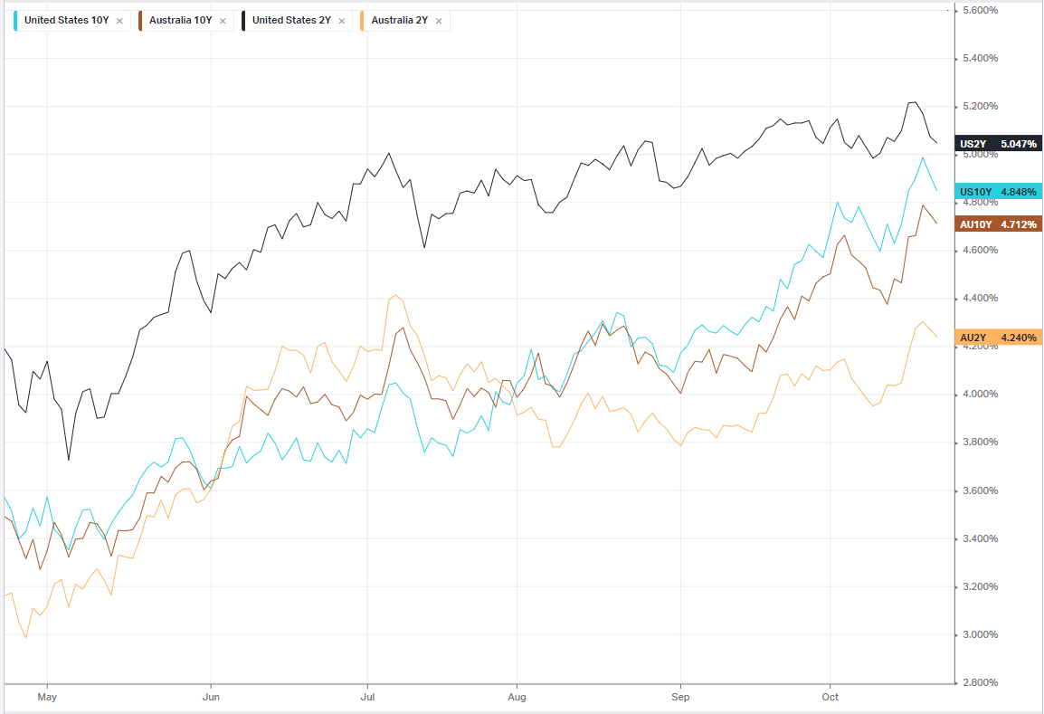 Treasury yields slipped following their recent multi-year highs, with the yield on the US10Y falling to 4.854% after rising to a 16-year high of 5.025% in the European session. The surge in longer-term Treasury yields have been driven by several factors including stronger-than-expected economic growth and stubborn inflation as well as a jump in supply as the U.S. Treasury steps up the pace of borrowing. The move comes just over a week ahead of the Federal Open Market Committee two- day meeting slated for Oct. 31