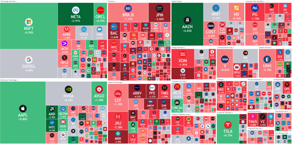 Big tech regained some ground after a rough week and the DOW slumped as investors digested contrasting corporate earnings as Amazon and Intel impressed, but underwhelming results from oil majors including Chevron left energy stocks nursing heavy losses.
