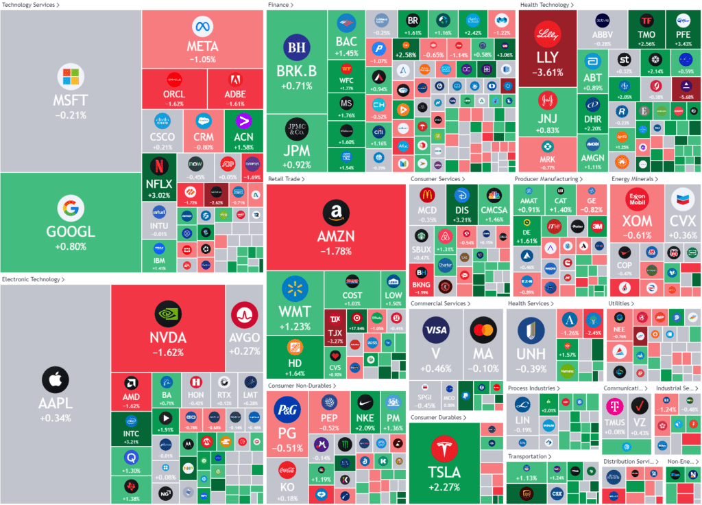 Tech stocks took a breather following a rally a day earlier amid weakness in Meta Platforms, though Microsoft ended flat despite launching its own chip, Maia 100, for AI that is expected to compete with Nvidia as demand for hardware to power artificial intelligence gathers pace. NVIDIA, which closed a record high a day earlier, fell 2% to snap its 10-day winning streak.