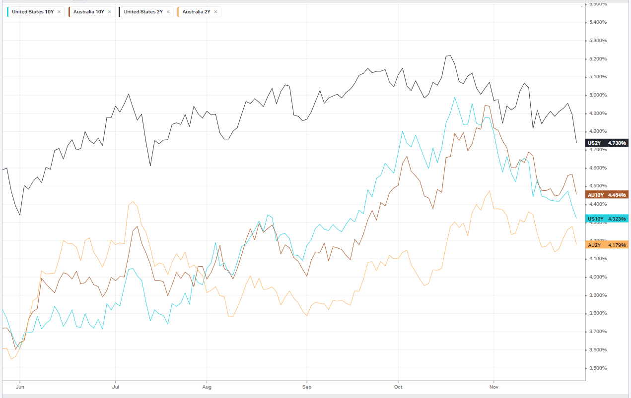 Federal Reserve Board Governor Christopher Waller said he was “increasingly confident” that policy is currently well positioned to slow the economy and get inflation back to 2% target. Adding to clout to bets of a Fed rate cut early next year, Waller added that should data show disinflation continuing for several more months, the Fed “could then start lowering the policy rate just because inflation’s lower.” Treasury yields fell on the remarks, with the yield on United States 2-Year falling nearly 12 basis points to about 4.74%, while the yield on the United States 10-Year fell 6 basis points to 4.330%.
