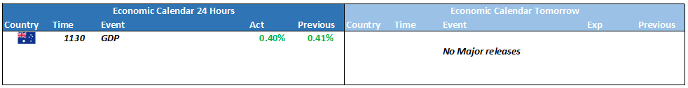 The ASX will likely bounce marginally today as the financial press narrative of yesterdays RBA meeting is largely positive. At 1130 we will see AU GDP, expected at 0.4% for the quarter, where the likelihood is that only a significantly higher number will effect the market.