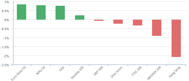 Stocks finished mixed overnight with downside momentum curbed by rising tech stocks as Treasury yields fell after data showed labor demand fell to a two-year low.