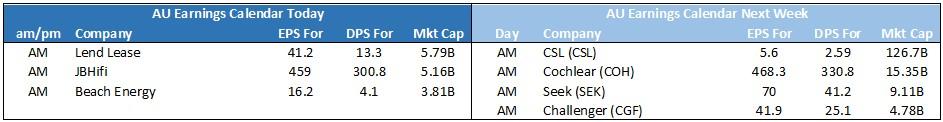 The weak offshore lead, rising yields and worsening Chinese data will set a poor tone to start the week, however the ASX will be focused on earnings for the next couple of weeks with the likes of CSL, CIP, TLS and AKE reporting results (for Earnings calendar click here) only Ansell had delivered earnings at the time of writing this report