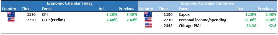 We should see a positive start to the day with the offshore lead firm. Todays focus will be on AU CPI data at 1130am with a high number potentially backing the RBA into the “rate hike” corner.