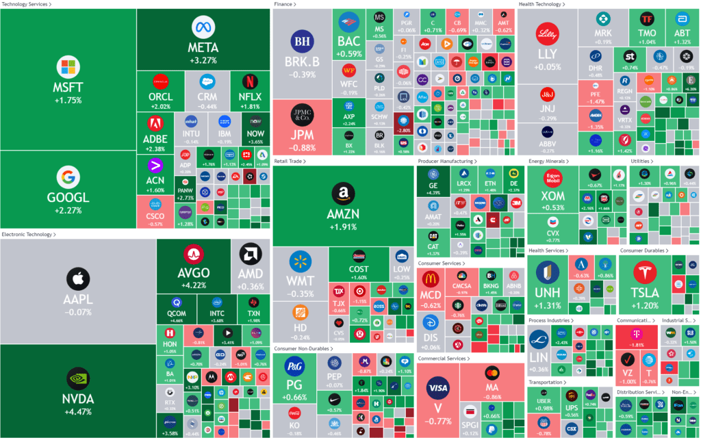 In particular, the Philadelphia Semiconductor index outperformed the broader market and hit a record high. The top percentage gainer was ON Semiconductor, up 7.8%. Nine the 11 major S&P 500 sectors rose, with communications services and information technology stocks jostling for position as the biggest gainer. Tech last had the lead with a 2% gain while communications services was up 1.9%.