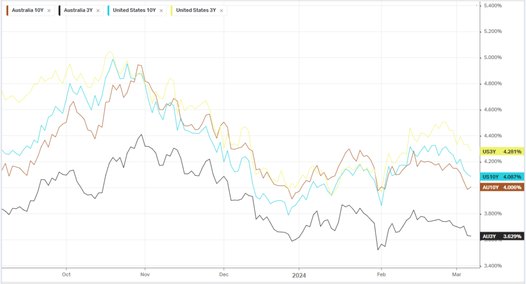 Fed Chair Jerome Powell said the U.S. central bank is “not far” from being confident that inflation is declining toward the 2% target, which would make rate cuts possible. His comments reinforced investor hopes for a first rate cut in June, boosting equity indexes that had faltered in the days leading up to the testimony. Fed Governor Michelle Bowman said the U.S. economy is not at the point where the central bank should reduce interest rates. The ECB also flagged rate cuts are in the pipeline, sending European yields lower.