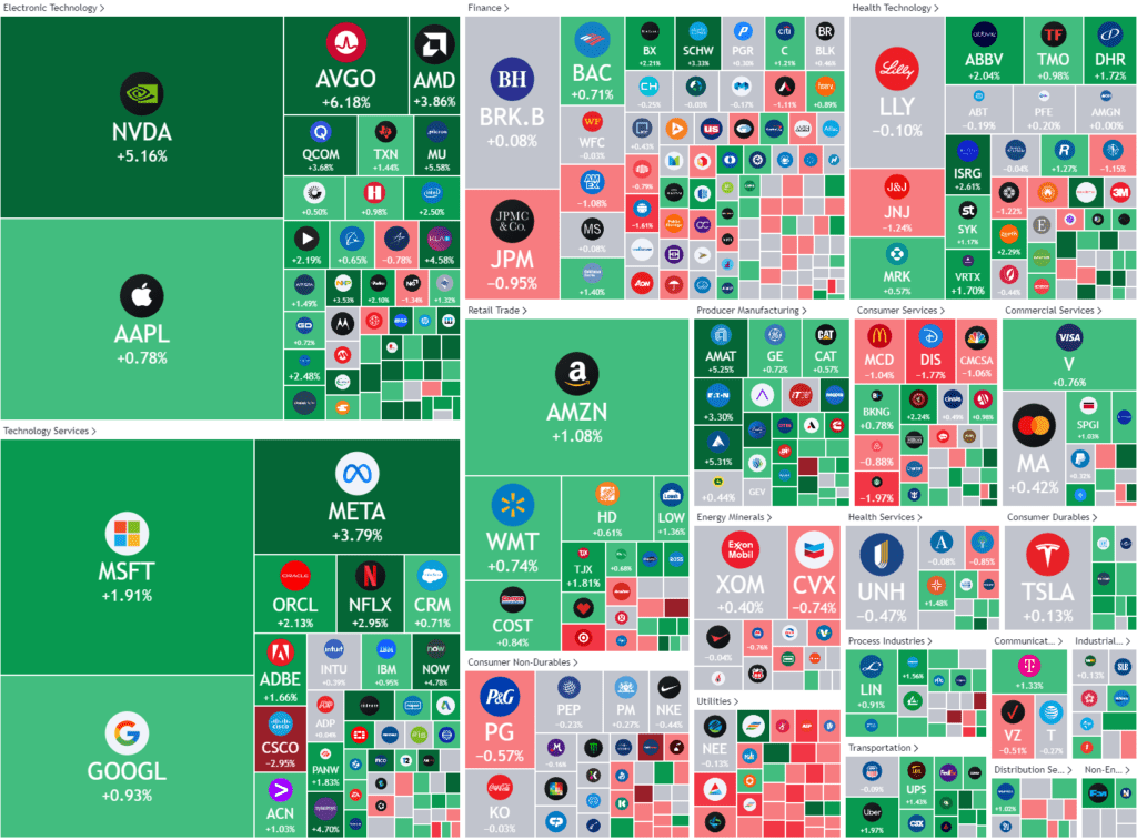 Apple rose 1%, briefly recapturing its $3 trillion market cap, as optimism continues to build ahead of the tech giant’s AI conference next week. Alphabet and Microsoft were also leading to the upside.