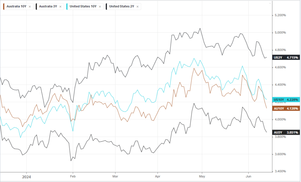The University of Michigan’s preliminary consumer sentiment index declined to65.6 in June, the from 69.1 a month earlier, while one-year and five-year inflation expectations eased to 2.9% and 2.8% from 3.1% and 2.9%, in the prior month, respectively. The one-year preliminary inflation expectation was unchanged at 3.3% for the month in June, though a higher than the 3.2% expected. Still, bets on inflation cooling further have been boosted this week after producer prices unexpectedly fell in May, and consumer price index slowed more than expected, stoking optimism that a disinflationary trend is in play, likely leading to lower interest rates by the end of the year.